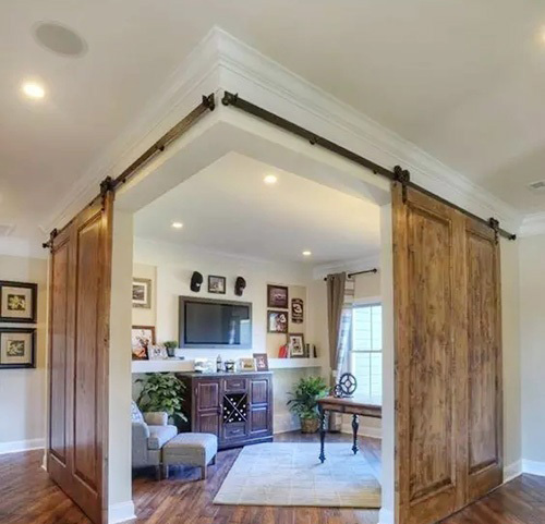 图片大全,常见的推拉门轨迹多是直线的,但是这款实木推拉门使用两扇门构成一个直角,是不是改写了你的知道呢?假如你家里也选用这样的规划,一定会很让人冷艳。